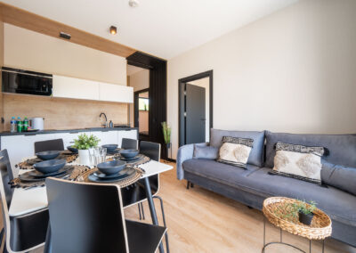 Salon został wyposażony w rozkładaną, 2 osobową nowoczesną kanapę, stolik kawowy oraz stół z krzesłami, aby cała rodzina mogła wspólnie spożyć posiłek. W pokoju dziennym można również oglądać telewizję i korzystać